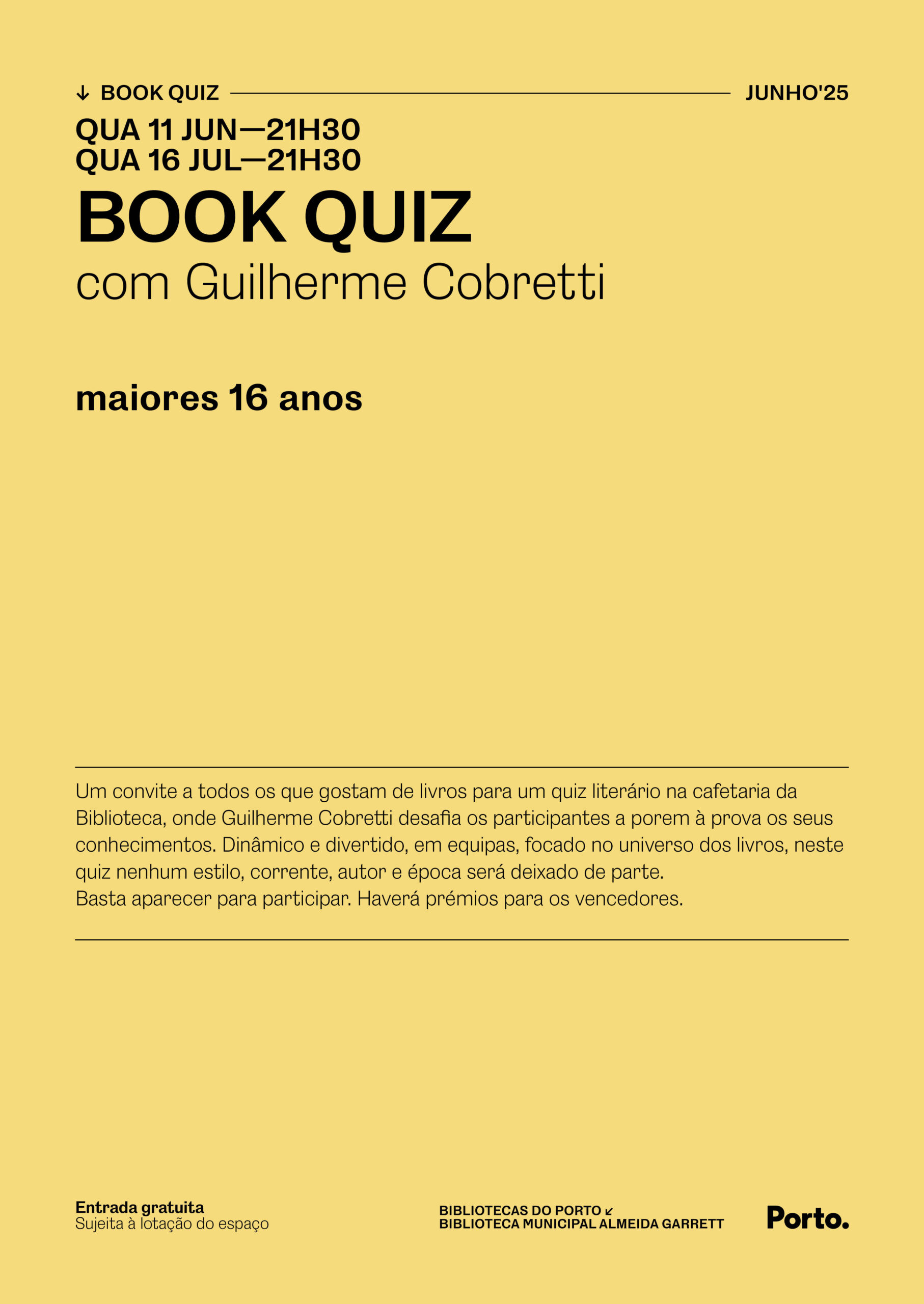 Um convite a todos os que gostam de livros para um quiz literário na cafetaria da Biblioteca, onde Guilherme Cobretti desafia os participantes a porem à prova os seus conhecimentos. Dinâmico e divertido, em equipas, focado no universo dos livros, neste quiz nenhum estilo, corrente, autor e época será deixado de parte. Basta aparecer para participar. Haverá prémios para os vencedores.