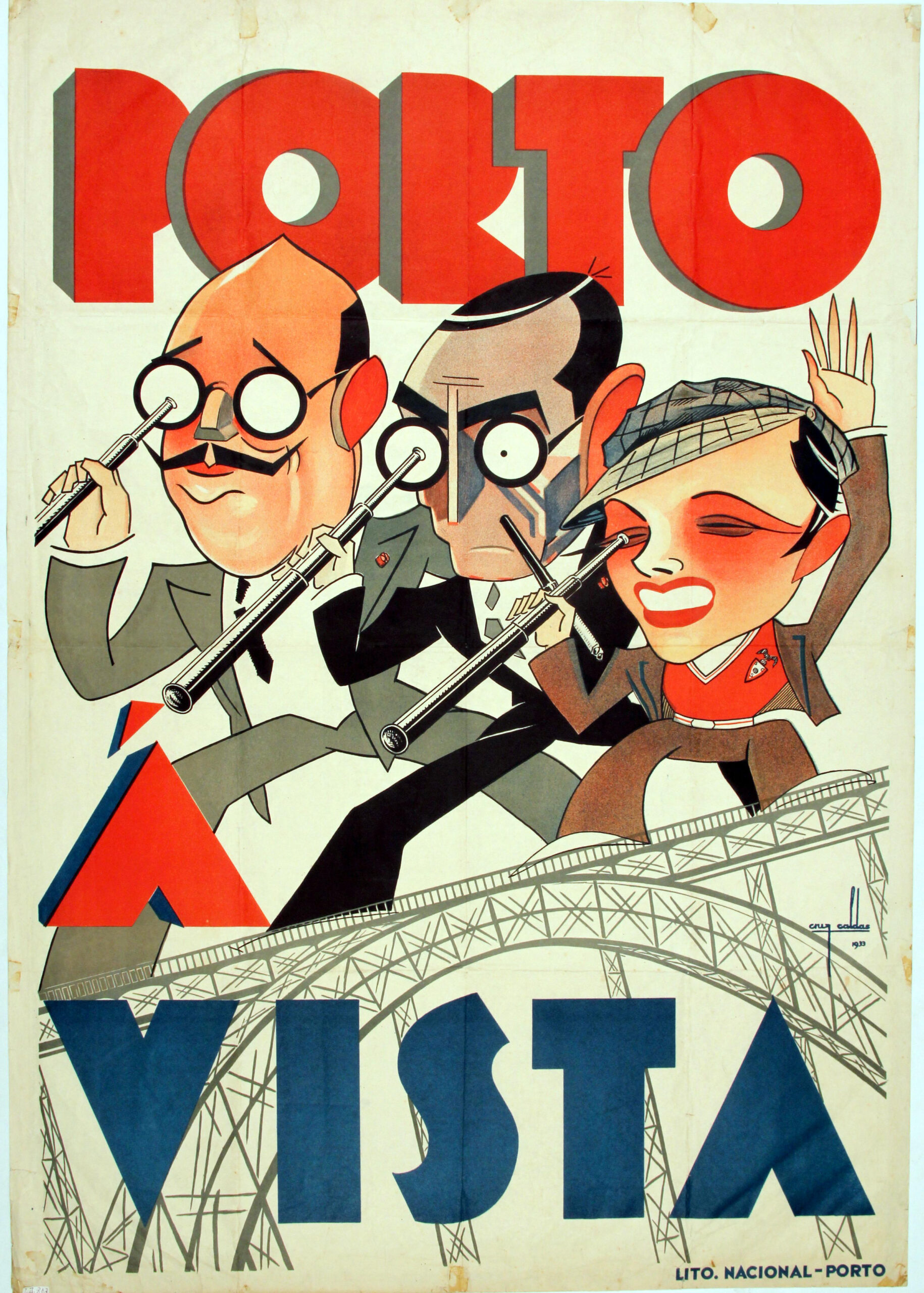 Cartaz publicitando o teatro de revista “Porto à Vista”, da autoria do caricaturista e maquetista António Cruz Caldas, impresso pela Lito. Nacional - Porto. Câmara Municipal do Porto – Arquivo Histórico.