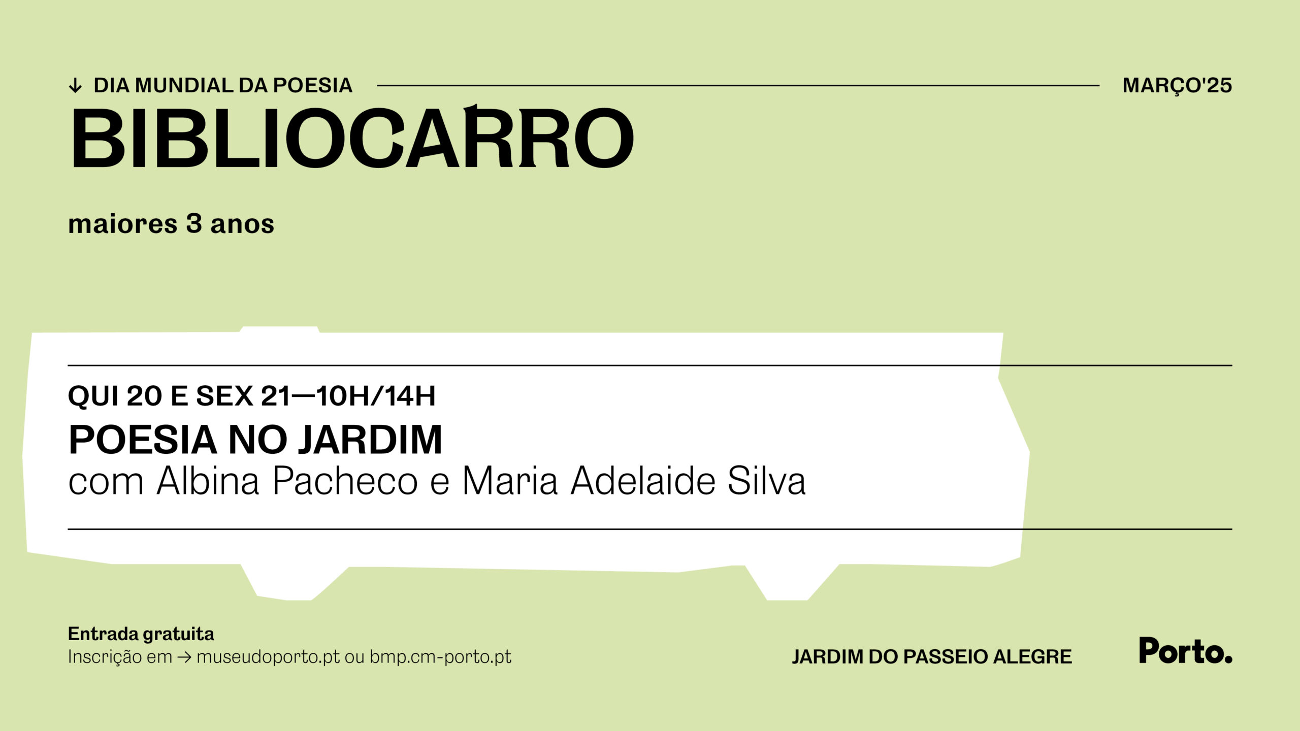 Para assinalar o Dia Mundial da Poesia, o Bibliocarro faz paragem no Jardim do Passeio Alegre, para fazer «Poesia no Jardim». Esta oficina tem como objetivo explorar a poesia, com especial enfoque nos autores portuenses.