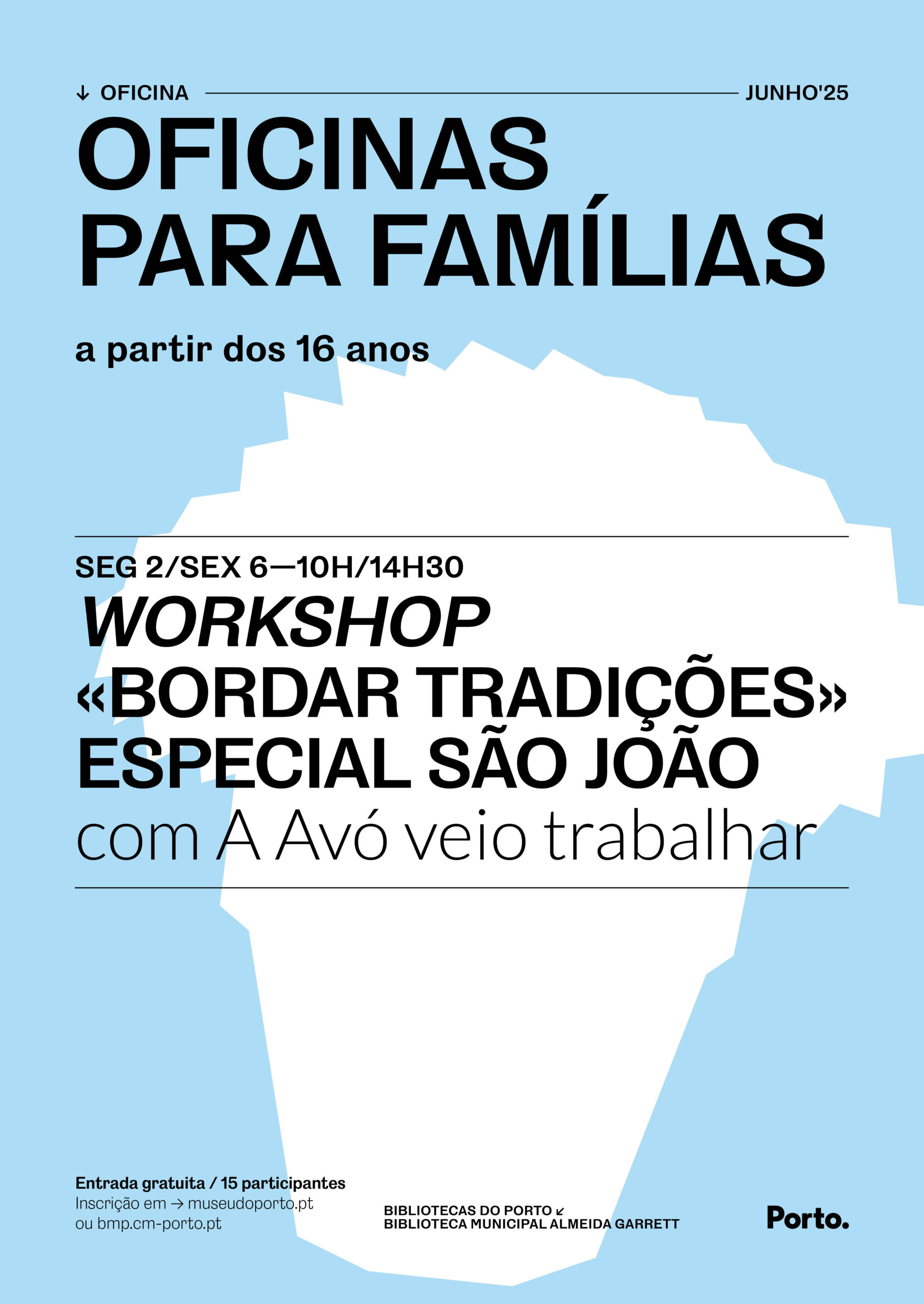 Com esta oficina celebramos a riqueza das tradições populares através da arte do bordado. Os participantes terão a oportunidade de aprender a bordar elementos típicos da festa de São João, como as icónicas cascatas e os símbolos que marcam esta celebração. Com orientação d’ A Avó veio trabalhar, nesta iniciativa será possível combinar técnicas de bordados tradicionais com uma abordagem criativa e contemporânea. Ao longo da oficina, não só se preserva o saber antigo do bordado, mas também se reforça a importância de manter vivas as memórias culturais da festa de São João, criando peças únicas que contam histórias de celebração e identidade.