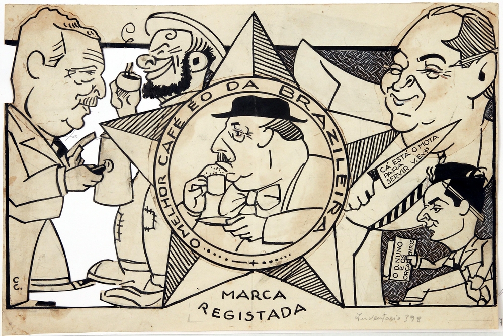 António Cruz Caldas, 1932. Desenho original a tinta-da-china para publicação no jornal “Pirolito”, ilustrando o Zé Povinho e homens ilustres do Porto, com o slogan do café “A Brasileira”