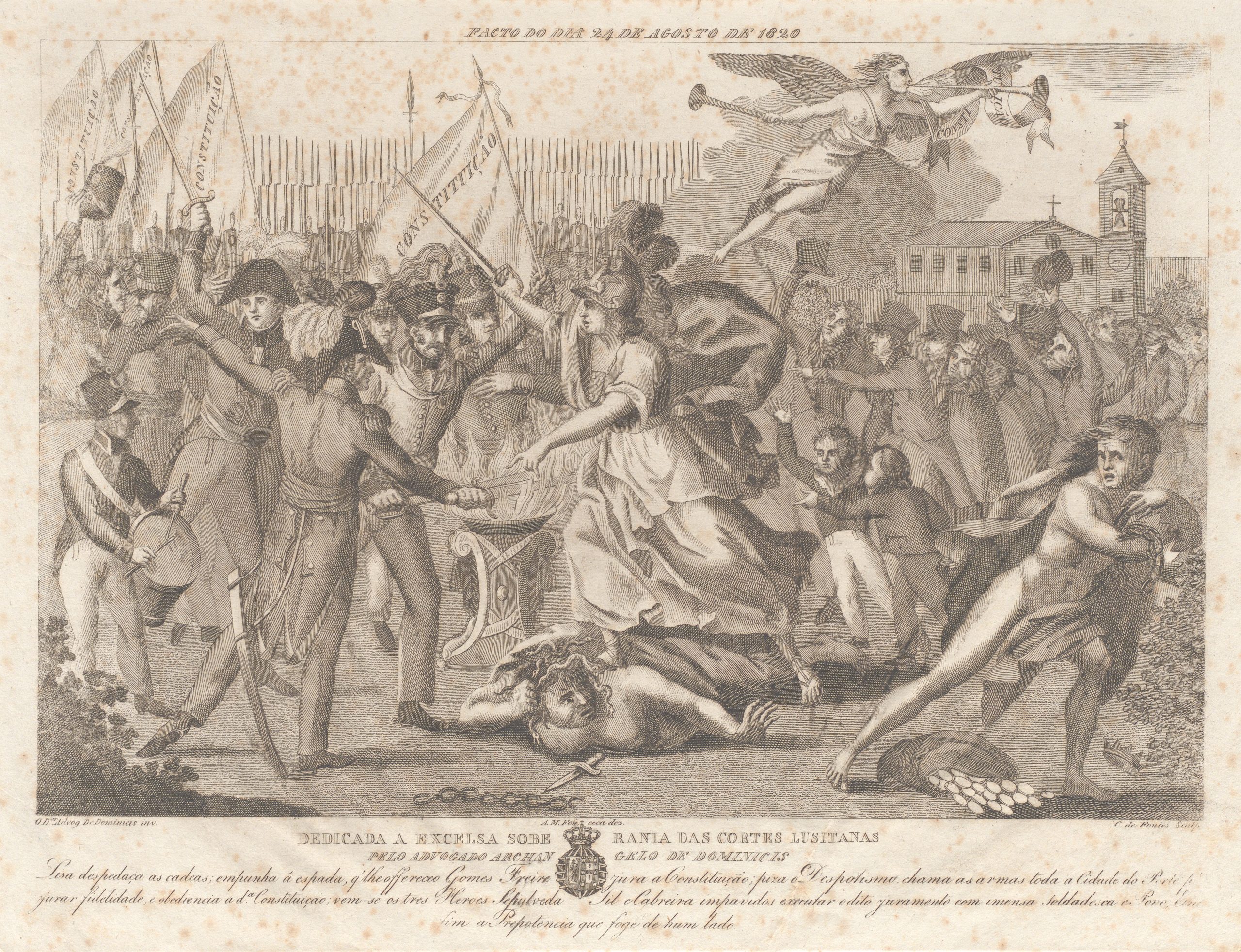 Alegoria à Revolução de 24 de agosto de 1820, no Porto. Desenho de António Maria da Fonseca, 1820. Gravado por Constantino de Fontes
